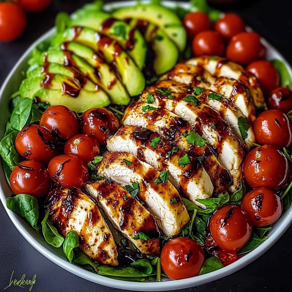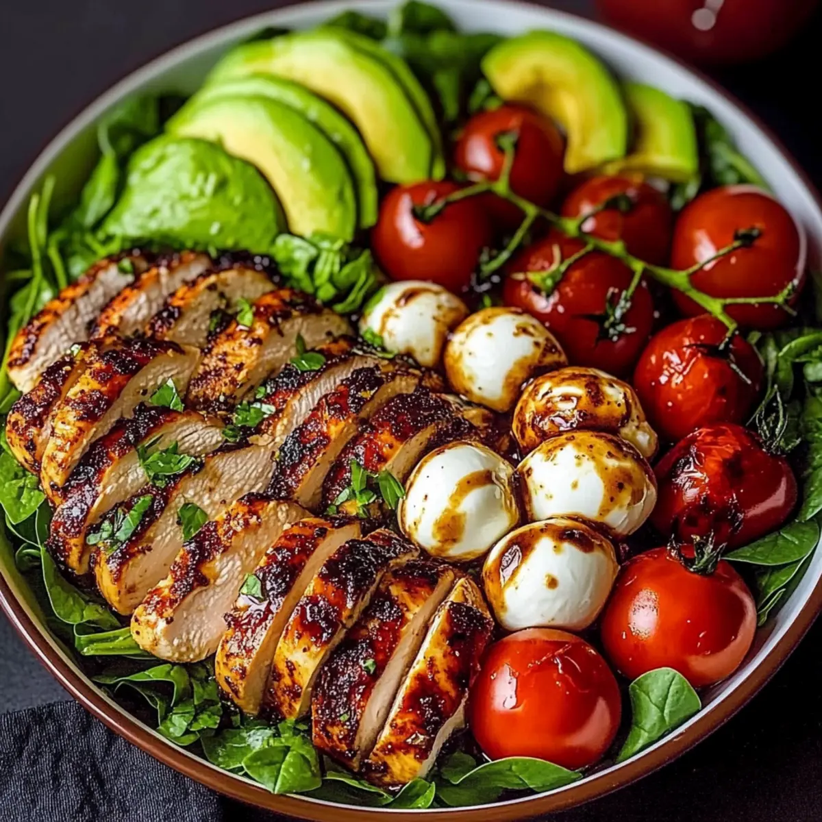 Lay a generous bed of fresh spinach on a large serving platter or in a bowl. Arrange the sliced chicken over the top, followed by the avocado, mozzarella balls, and halved cherry tomatoes. This colorful display not only catches the eye but also combines the delicious flavors of the salad.
