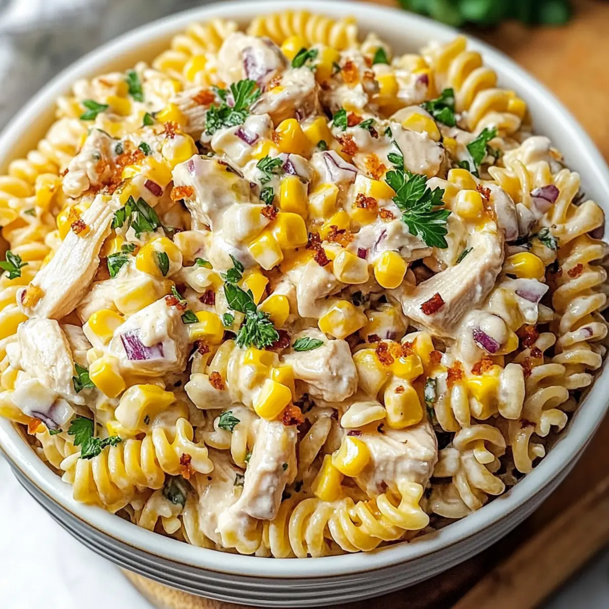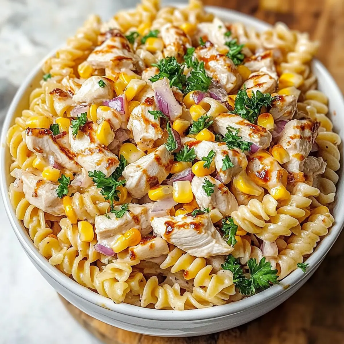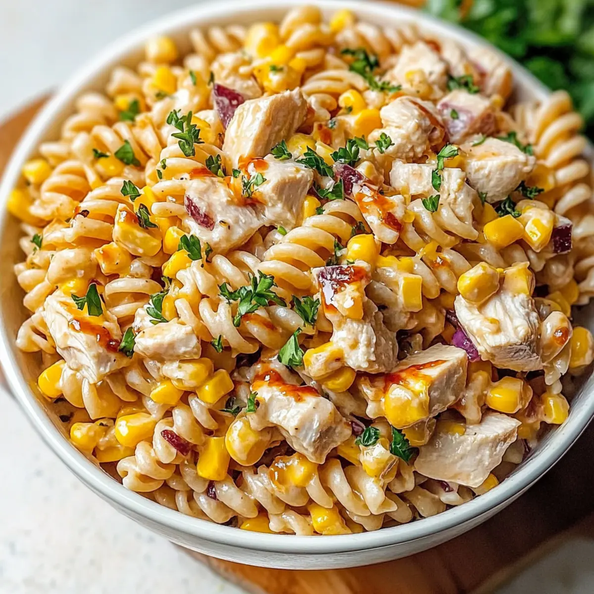 - Garnish with parsley before serving. Enjoy your BBQ Chicken Pasta Salad!