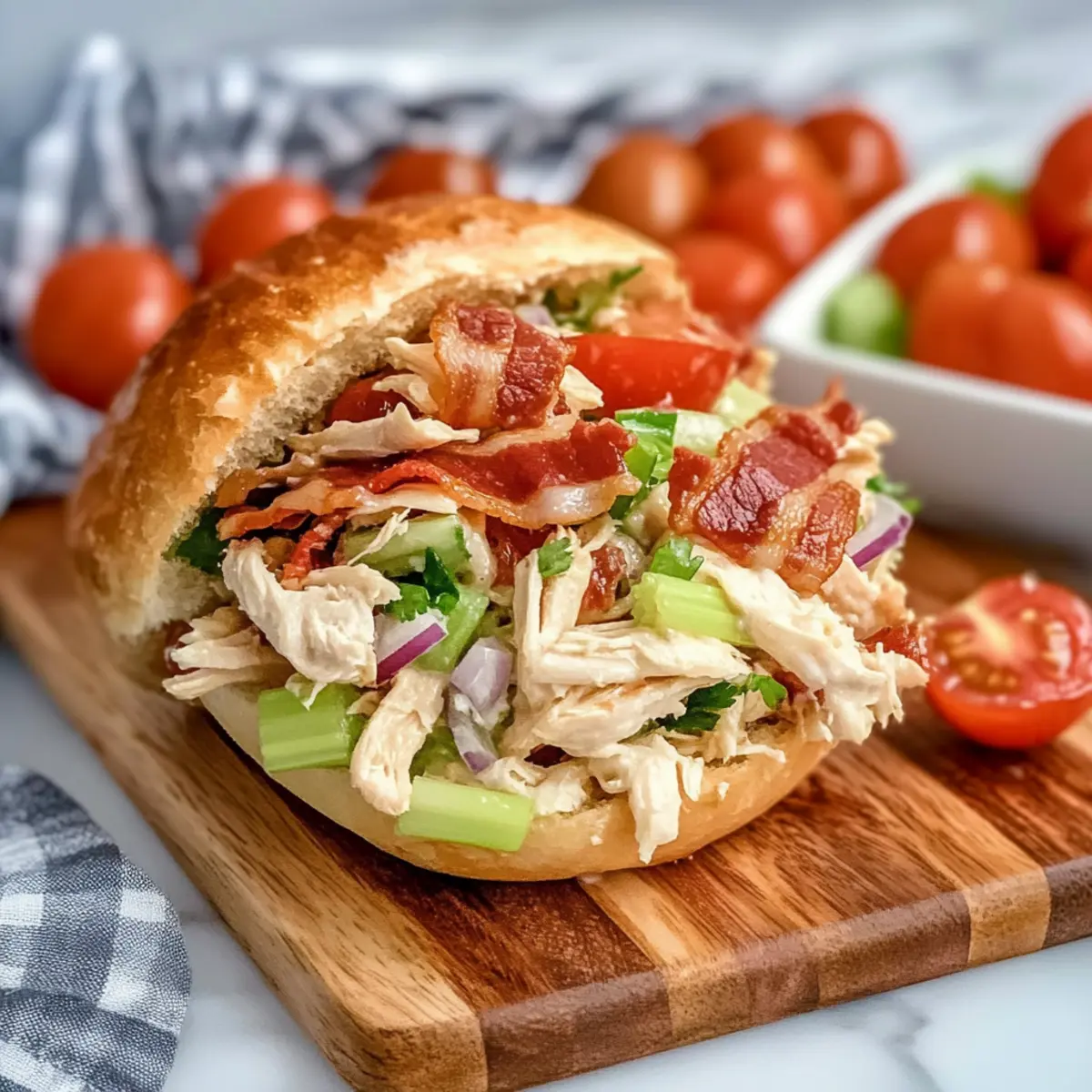 Begin by gathering your ingredients. In a large mixing bowl, combine 3 cups of shredded cooked chicken, about 6 slices of crispy diced bacon, 1 cup of halved cherry tomatoes, ½ cup of diced red onion, and 1 cup of diced celery. As you mix, visualize the vibrant colors coming together, making sure every component is evenly distributed for an inviting salad.