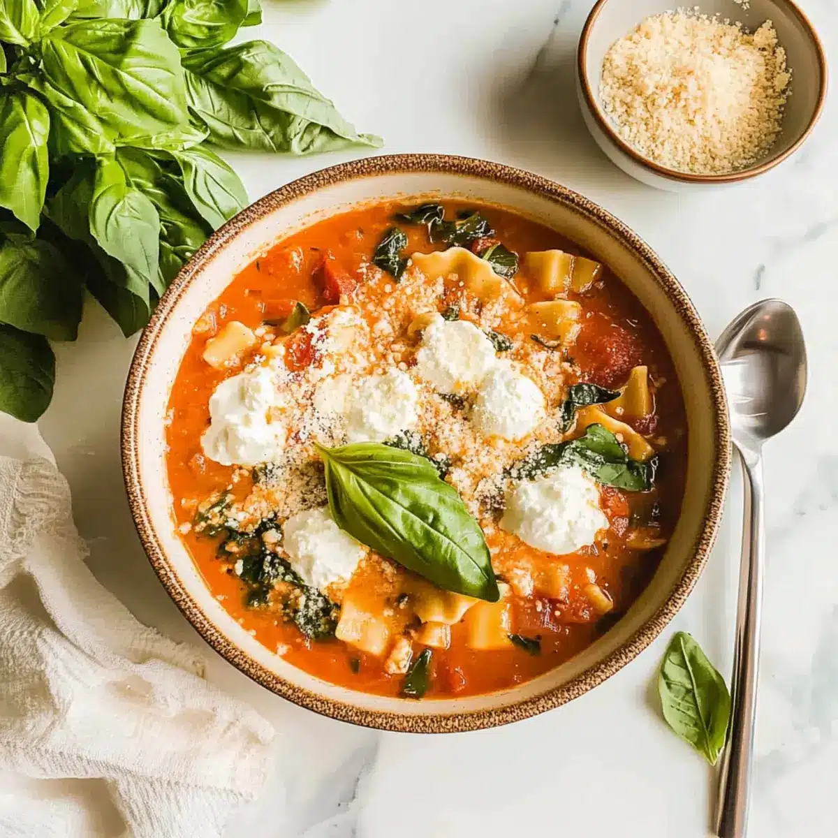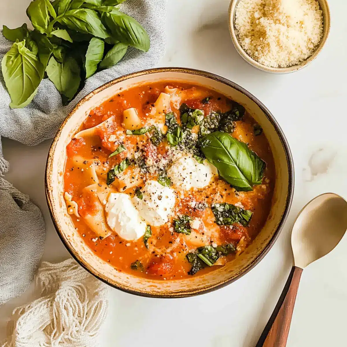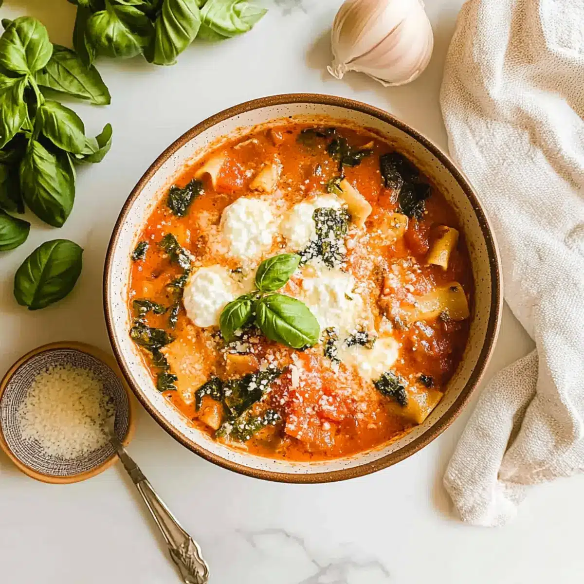 Ladle the hearty soup into bowls and top each serving with a generous dollop of ricotta cheese, a sprinkle of shredded mozzarella, and a dash of freshly grated parmesan. To finish, garnish with chopped fresh basil for a vibrant touch. Enjoy your comforting Easy Creamy Lasagna Soup!