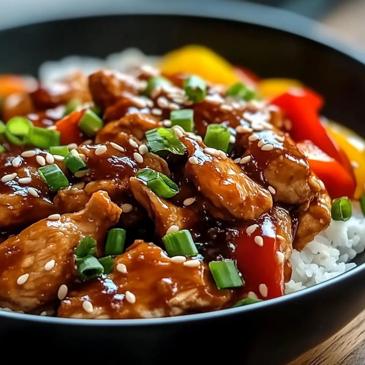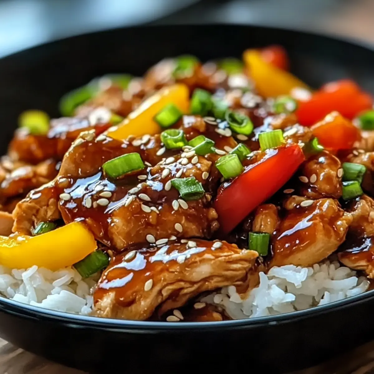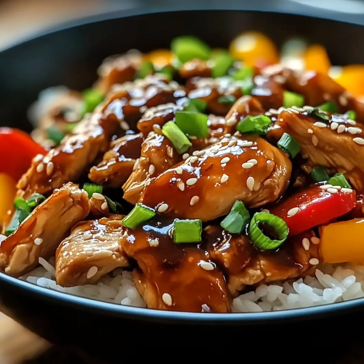 - Serve the chicken and sauce over a bed of cooked rice, garnished with green onions and sesame seeds.
