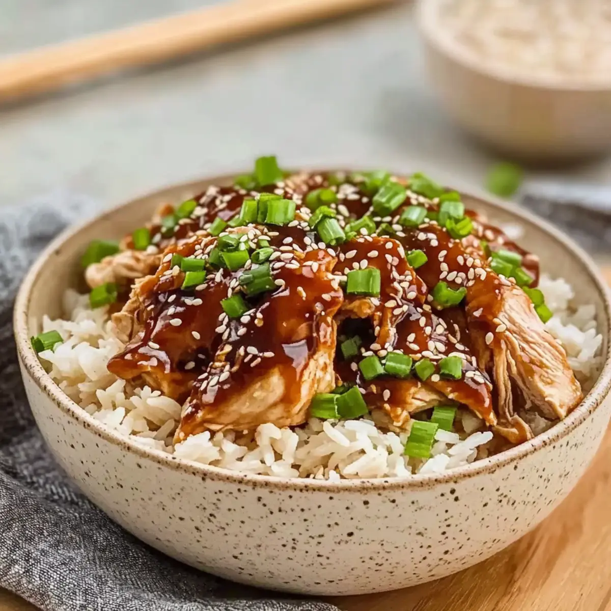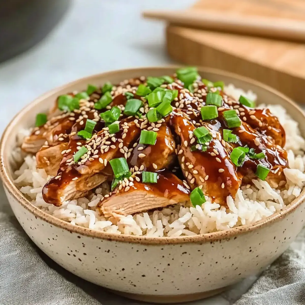 - Serve the Sweet Crock Pot Teriyaki Chicken over brown rice, garnished with green onions and sesame seeds.