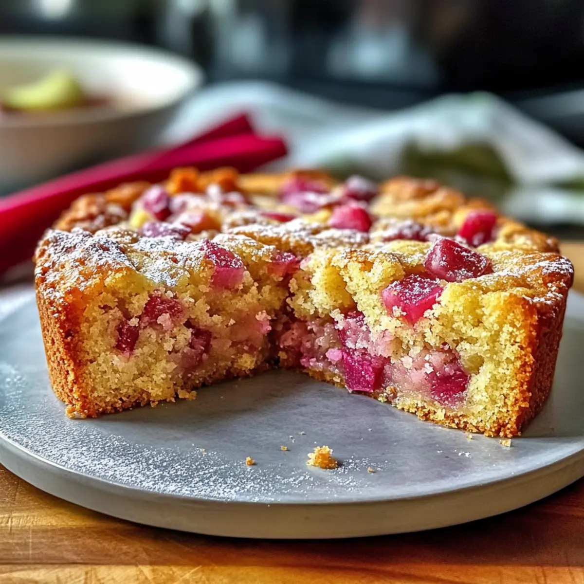 Get excited to bake this gorgeous cake that wraps the goodness of fresh rhubarb in a buttery embrace!